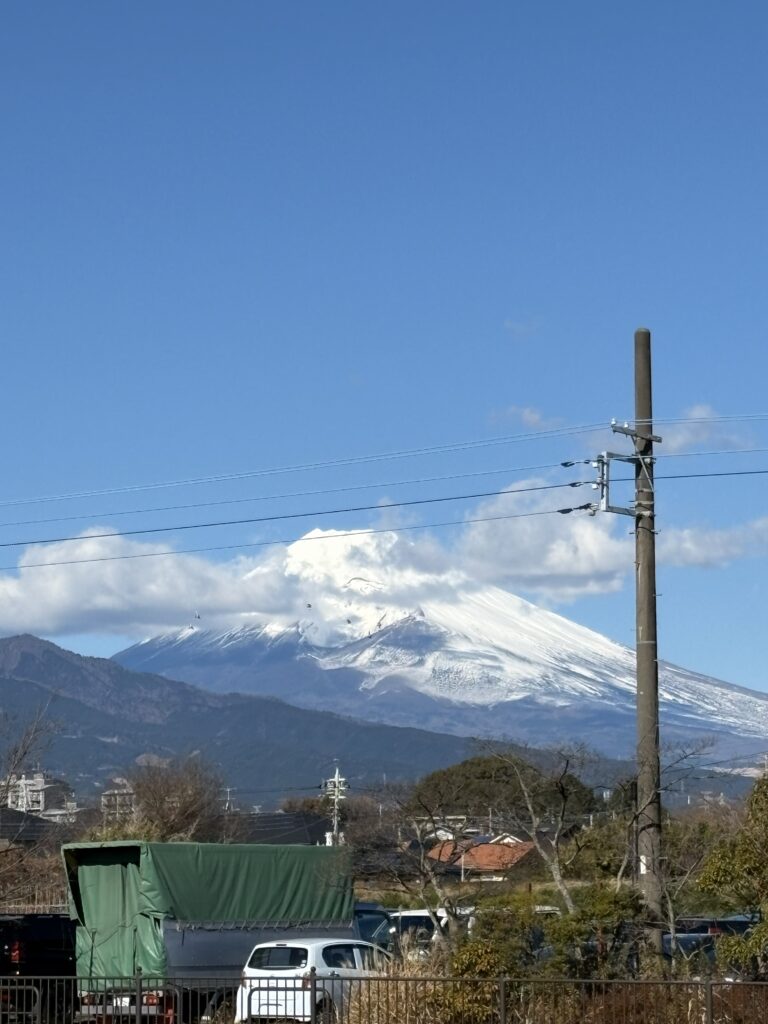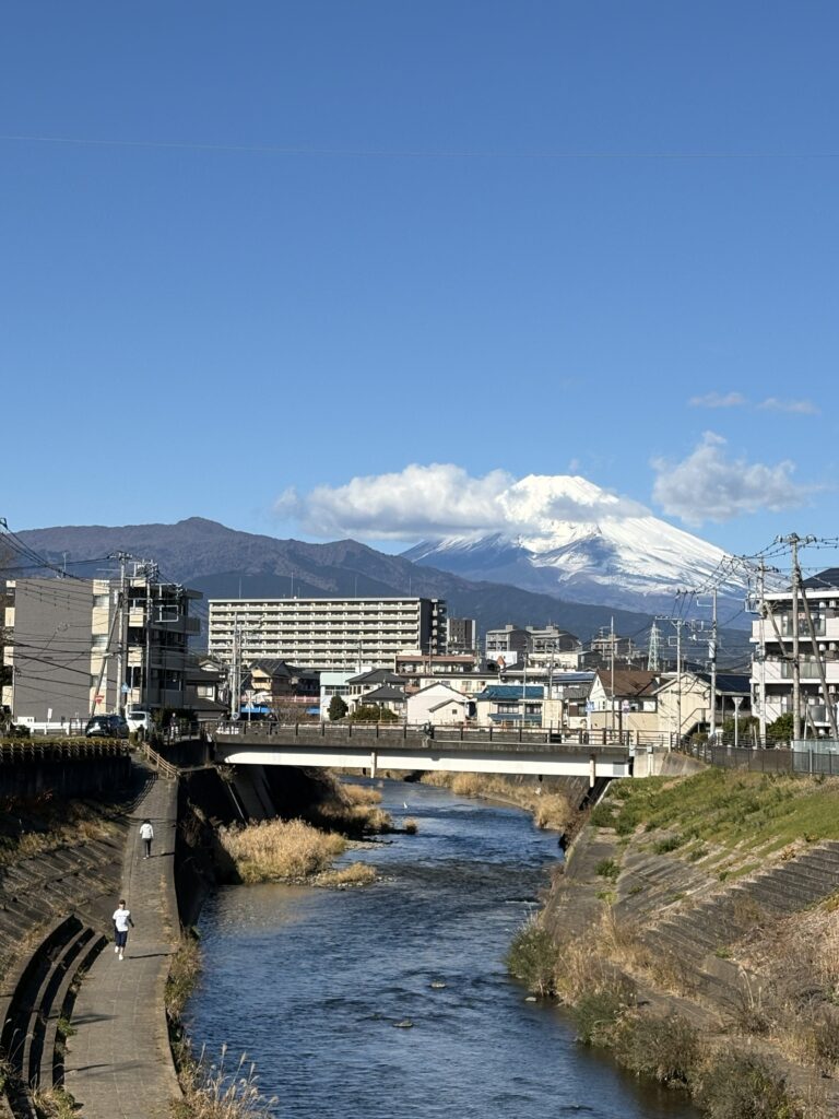 大場川沿いを歩きながら見えた、冬晴れの富士山。